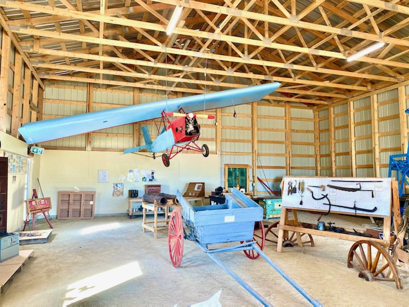 The fifth structure, the Heritage Building, was built in the 1990s and includes some of the Museum’s largest displays and artifacts. Two large murals dominate the building. The first is an accurate representation of the No. 2 Bombing and Gunnery School, which was located near Mossbank between 1940 and 1944 as part of the British Commonwealth Air Training Plan. The building stores a large collection of documents from the school as well as some displays of artifacts and uniforms from the base. The second mural represents the prairie around Old Wives Lake. The museum has collected a number of tools used by First Nations peoples around the Lake prior to European contact and these are spotlighted in the Heritage Building. One of the most eye-catching exhibits centers on a small airplane that is suspended from the roof. The plane was designed, built and flown by a local farmer, Cecil Goddard. Goddard built over a dozen different aircraft and flew them all with varying degrees of success. Some of his planes have been displayed in major airports and aviation museums, others, however, crashed with Goddard in them! Amazingly, despite his somewhat shaky flight record, Goddard emerged unscathed from every crash.